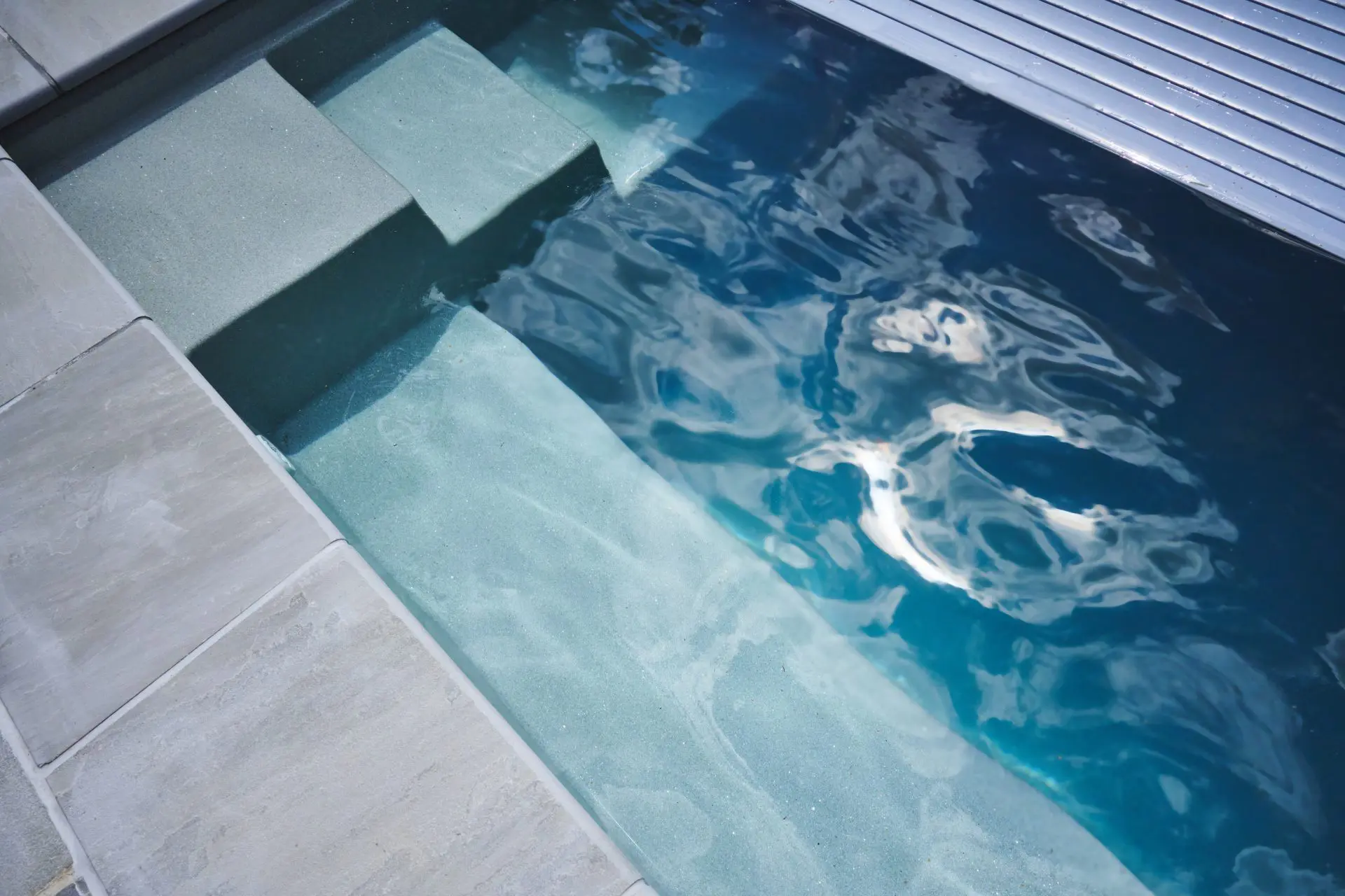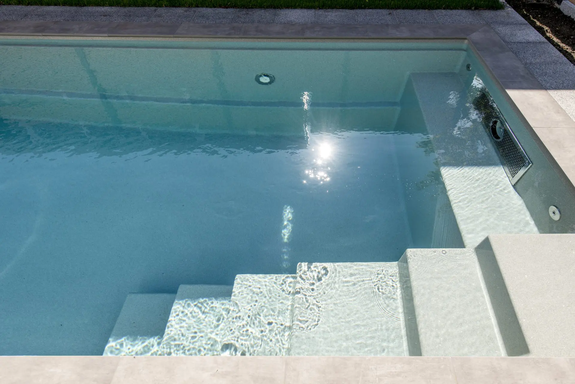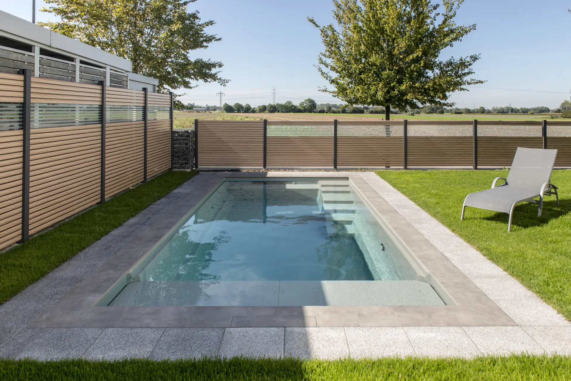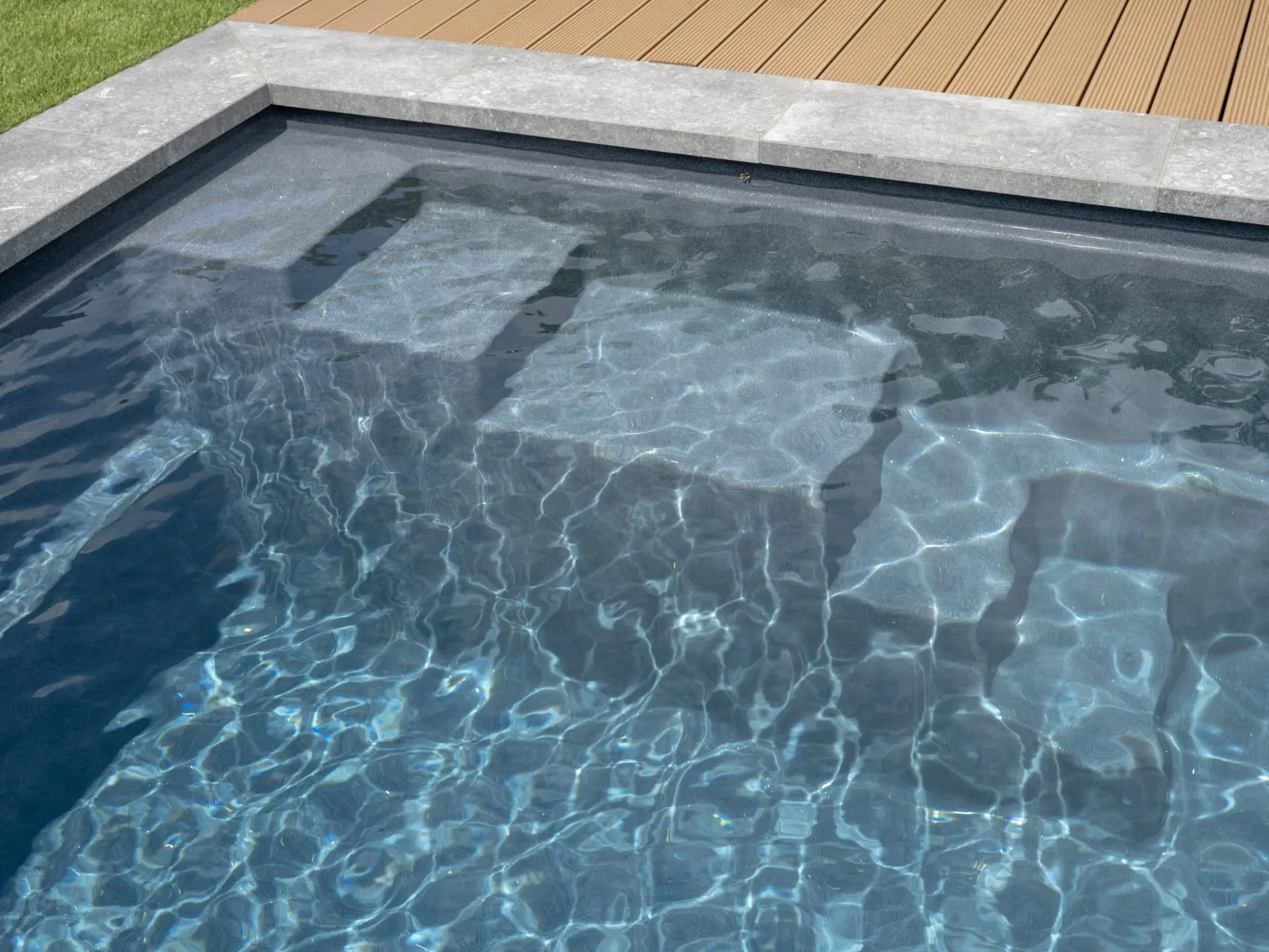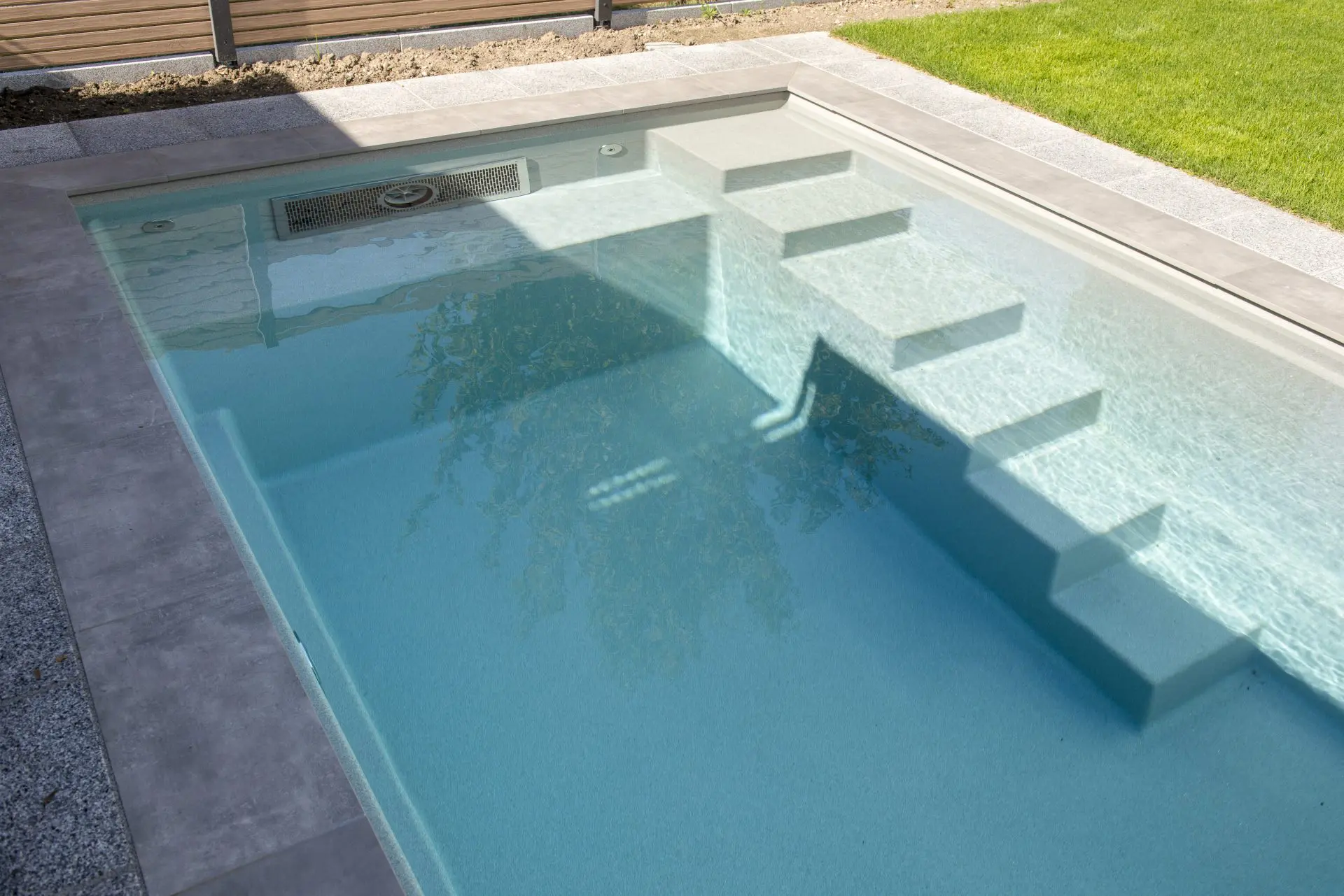 - A lépcsők és a medencefenék a COMPASS védjegye alatt álló SLIP STOP csúszásmentes bevonattal rendelkeznek