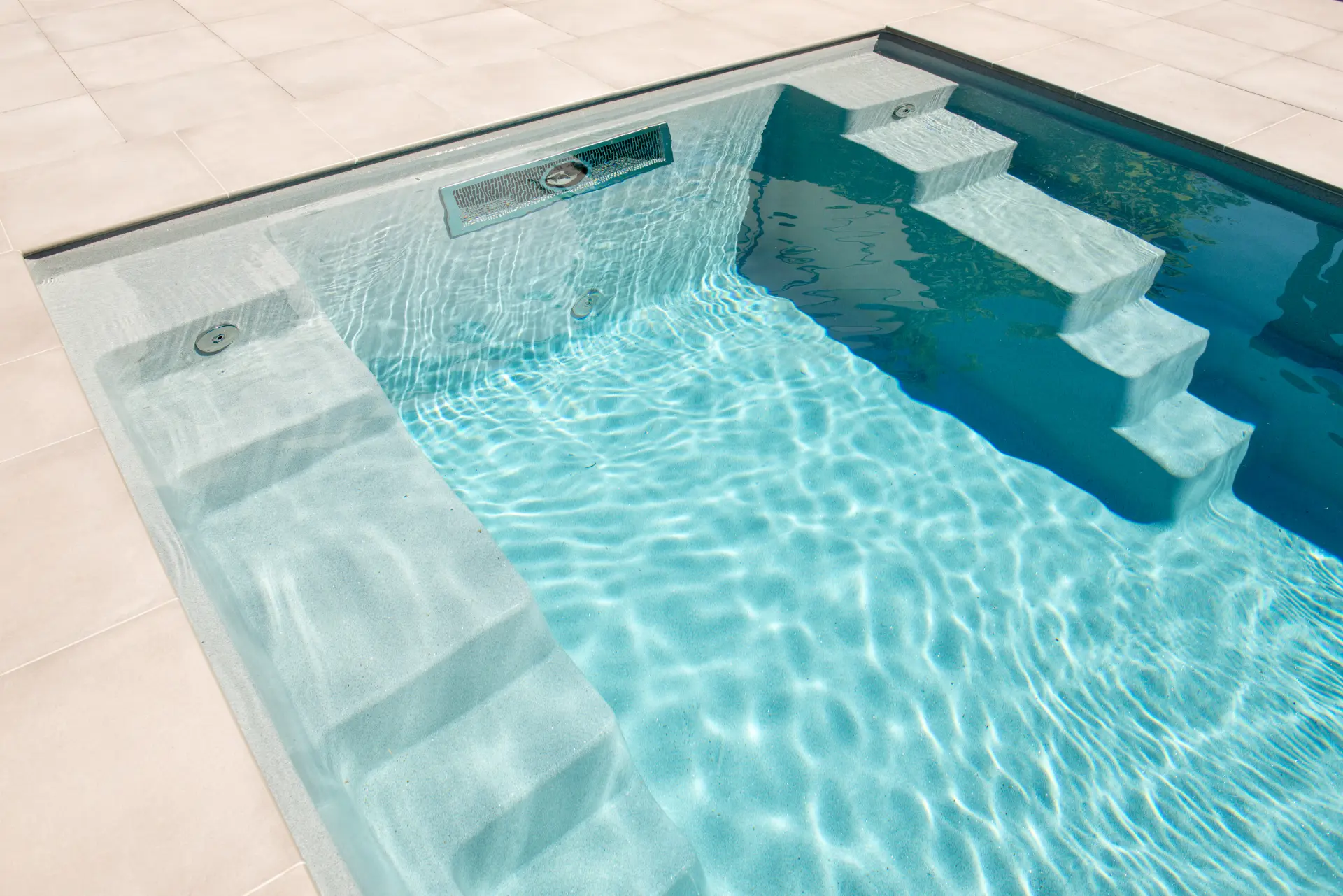 - A medence hosszanti oldalain biztonsági leállóperem fut végig (ez típustól függően elérhető), a gömbölyített élű lépcsők és a medencefenék a Compass védjegye alatt álló SLIP STOP csúszásmentes bevonattal rendelkeznek