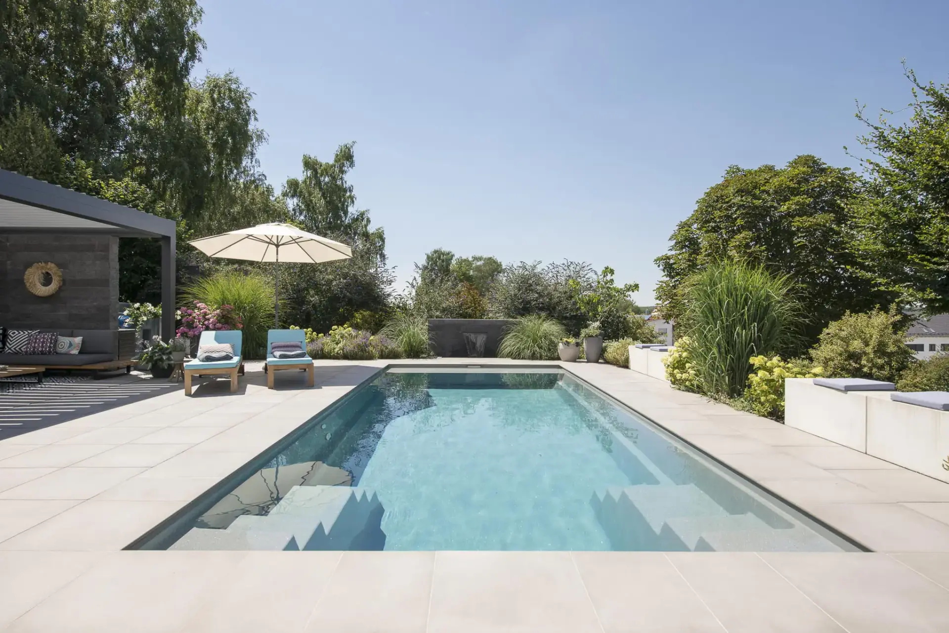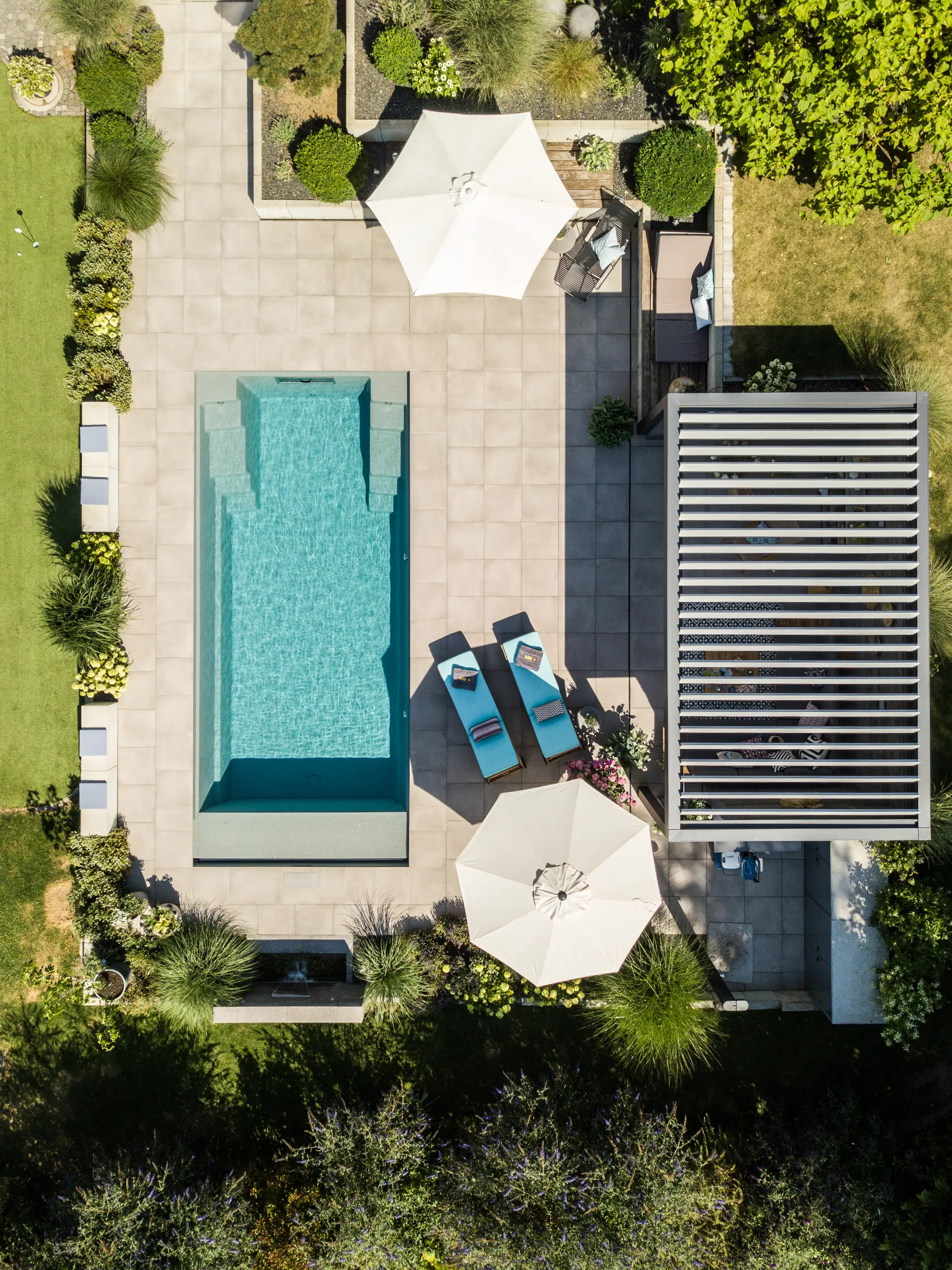 - A lépcsők kétoldalt helyezkednek el, ezért az úszásra használható területből a lehető legkevesebbet foglalják el, illetve az elhelyezkedésük miatt a medence szinte bármilyen telepítési igénynek megfelel