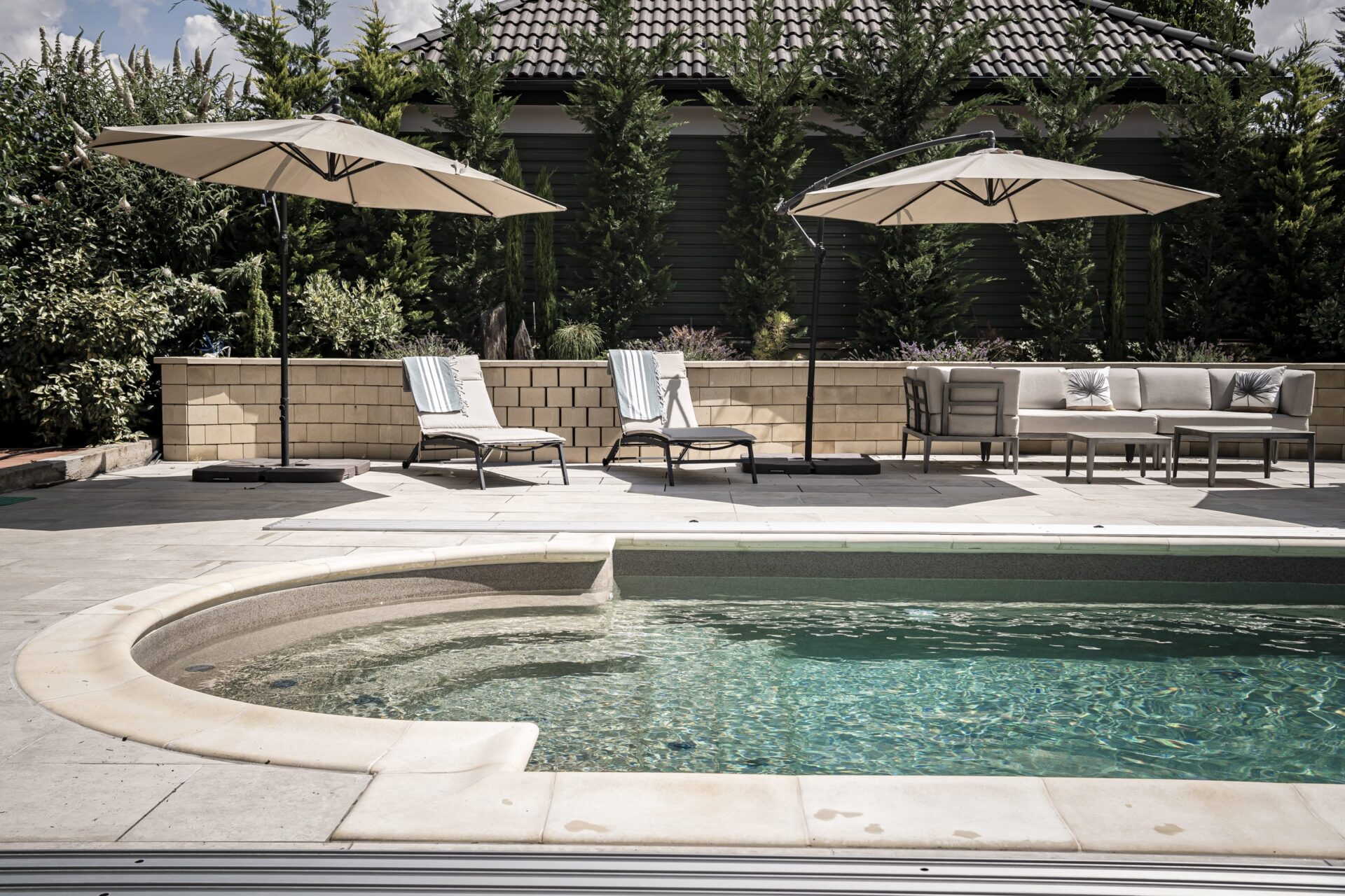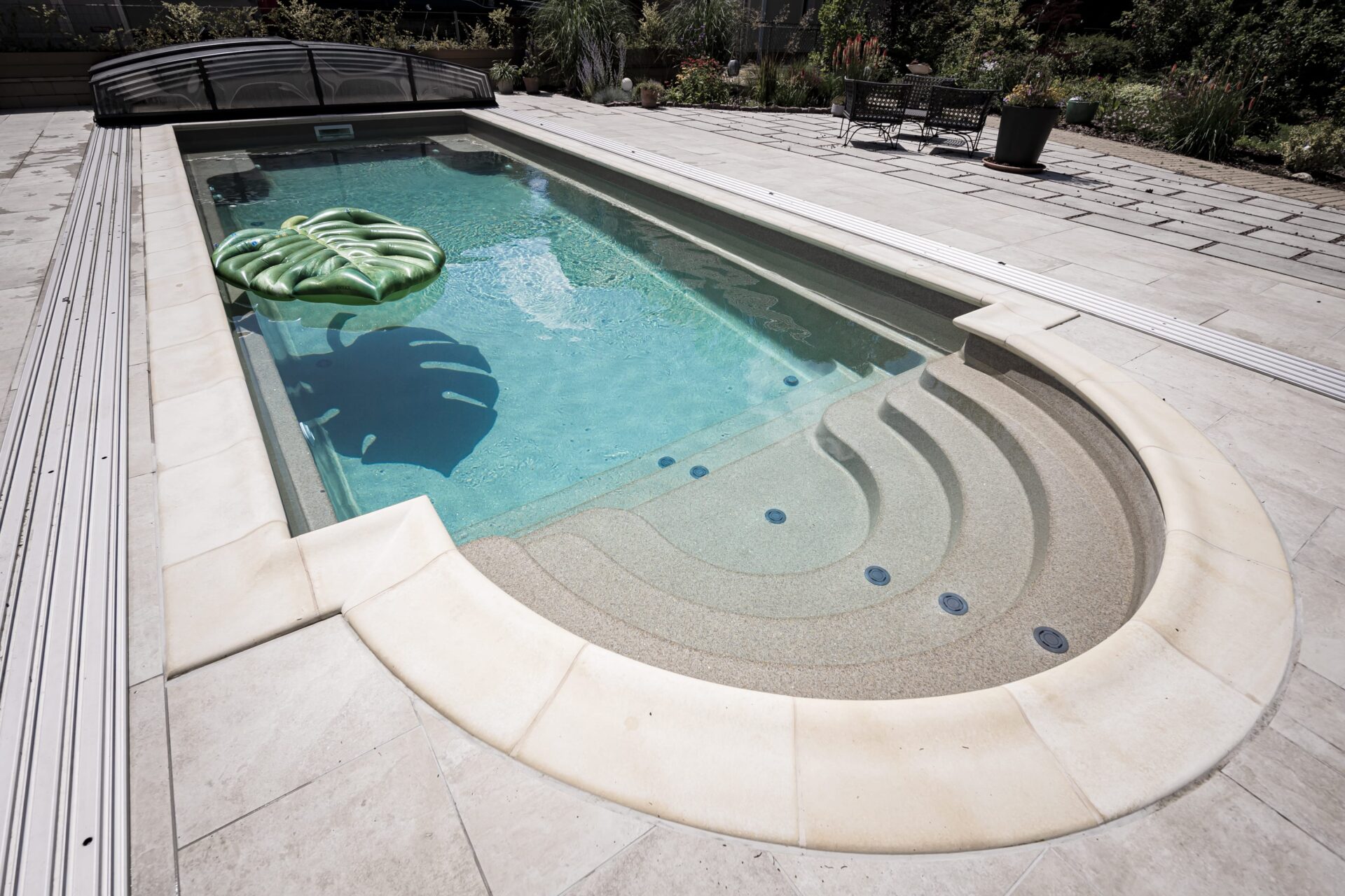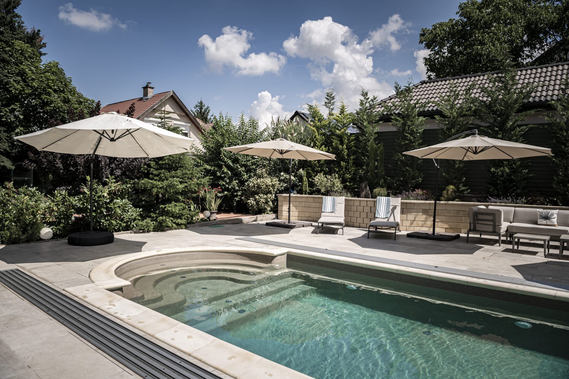 - Biztonsági vezetőperem a medence körül a takarási megoldáshoz, igényelhető rejtett rolóházas medencefedési megoldás